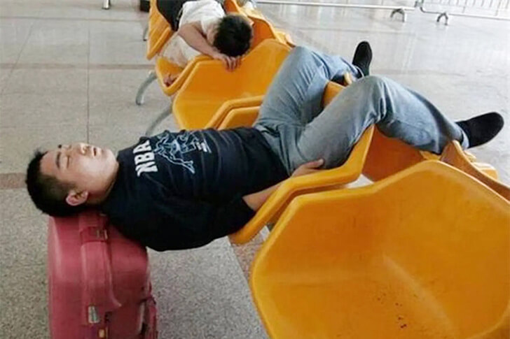 Air travel can be unpredictable, especially if you get stranded at the airport for any reason. Unsurprisingly, we have seen people sleeping in the weirdest positions on airport seats, walls, and even floors. This latest one is strange by its standards. It looks like this man figures out his way to get comfortable during delays.