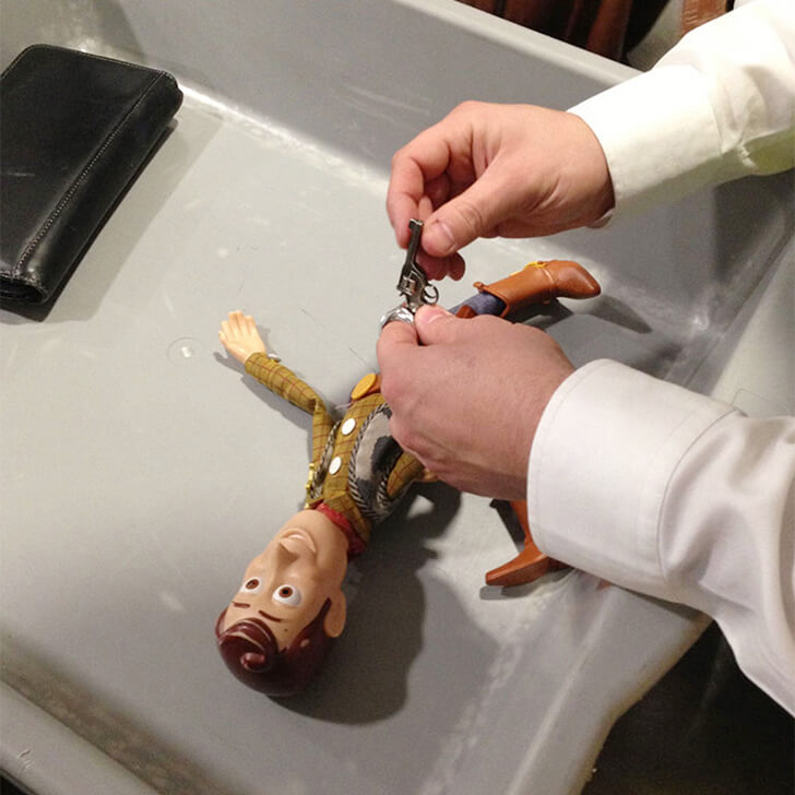 Security is highly prioritized by all staff and authorities in airports and on planes. Any objects that could pose a security threat to other passengers are confiscated before boarding. Looking at this photo, we are surprised to see Woody from “Toy Story” getting frisked and having the tiny toy gun taken away.