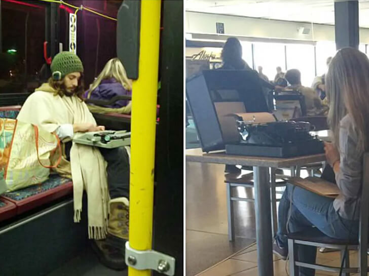 Interestingly, these pictures were taken at the Seattle airport just weeks apart. The woman on the right may perhaps have a strict deadline she needs to meet, and she’s not a fan of laptops. We can only wonder how heavy the typewriters must have been compared to the modern-day ones. Can someone get them an iPad, please?