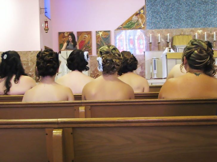 Nein, es handelt sich natürlich um eine optische Täuschung. Die Kleider der Brautjungfern sind rückenfrei und so geschnitten, dass man sie nicht über die Bank hervorschauen sieht. Deswegen wirkt es so, als ob die Damen nackig sind … Definitiv ein lustiges Bild!