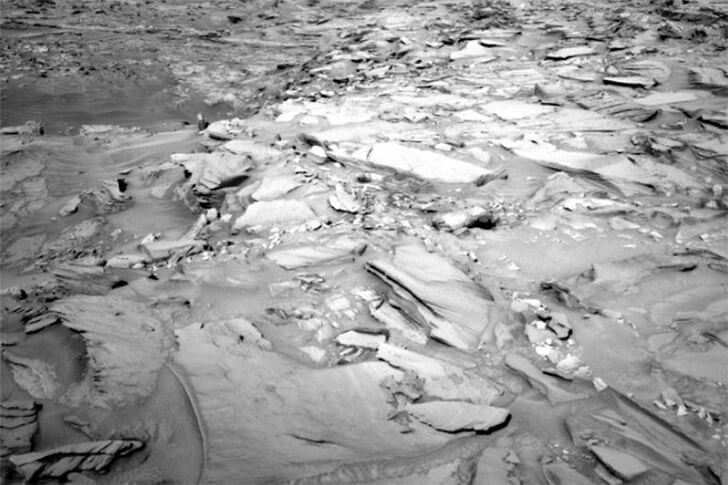 NASA released a raw picture from the Curiosity rover’s left navigation camera in 2016, which can be seen here. There’s a fish-like creature lurking just below the image’s bottom right corner, but it’s hard to make out at first glance.