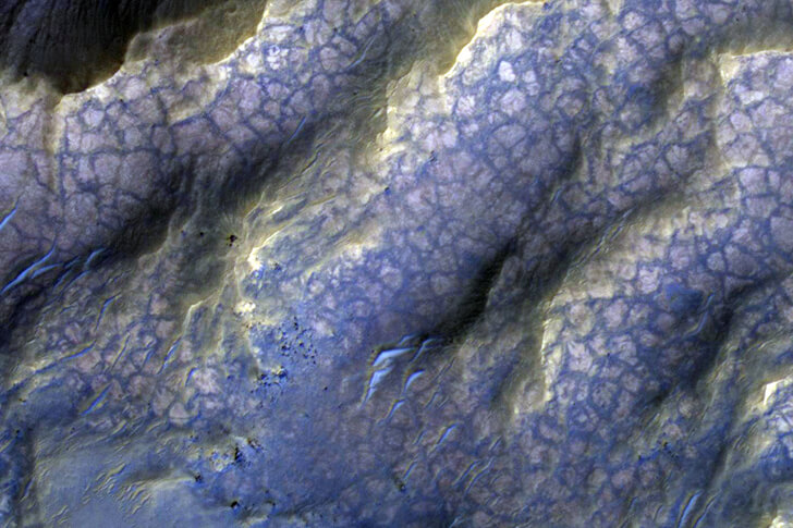 NASA’s Mars Reconnaissance Orbiter has captured this interesting surface structure, all thanks to rock and water interactions. Erosion and further exposure to the elements eventually uncovered the granite. The pinkish, almost dragon-like texture shows Martian bedrock that deliberately transformed into clay-bearing rock.