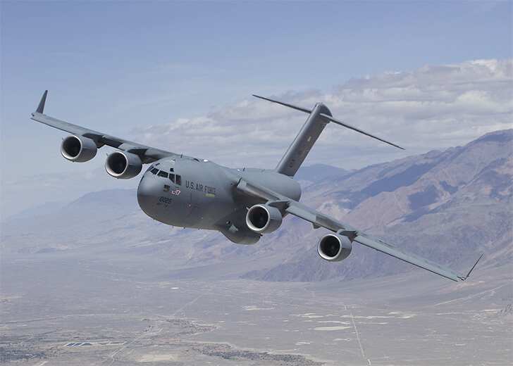 The C-17 Globemaster III is capable of carrying up to 170,900 pounds of cargo at a time. And even at full capacity, it can still perform short field landings and tactical missions. It can even serve as an air ambulance transport if needed.