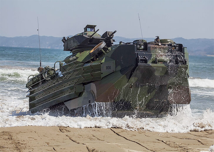 It has a speed of eight miles per hour in the water and 45 miles per hour when on land. Manned by three crew members, it can safely take 25 Marines from ship to shore. It is considered one of the most versatile vehicles in the Marine Corps arsenal because it can be used for both beach assaults and as a refueller.