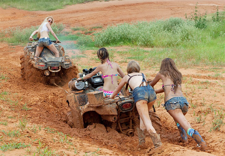 In a vivacious display of southern spirit and resilience, a picture captures a squadron of girls, bikini-clad, boots donned, manning their quad bikes through a field of mire. Dirt splashes and laughter echo in the southern heat, encapsulating the raw essence of unshakeable girl power. Two gritty femmes have dismounted, knee-deep in mud, pushing a bike with nonchalant grace.