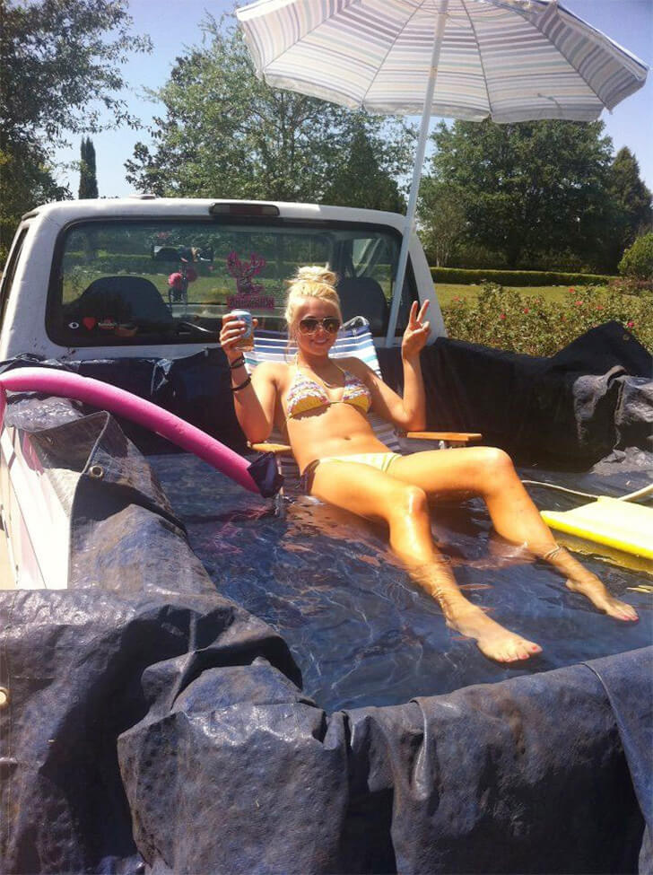 Improvise, adapt, overcome; words to live by in the sun-drenched South. Our industrious heroine, a testament to that spirit, transformed her sturdy truck bed into a haven of cool relief. Drenched in sunlight, she lounges in the DIY pool, an iced tea held aloft. Laid back in this makeshift oasis, she captures the essence of Southern ingenuity.