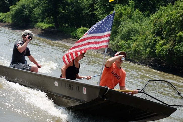 In the verdant swamplands, under a sapphire sky, three brave fishermen navigate the teeming river, their lures dancing atop the shimmering waters. Beers in hand, they toast to their shared pursuit of freedom, embodied by the American flag fluttering proudly above their heads.