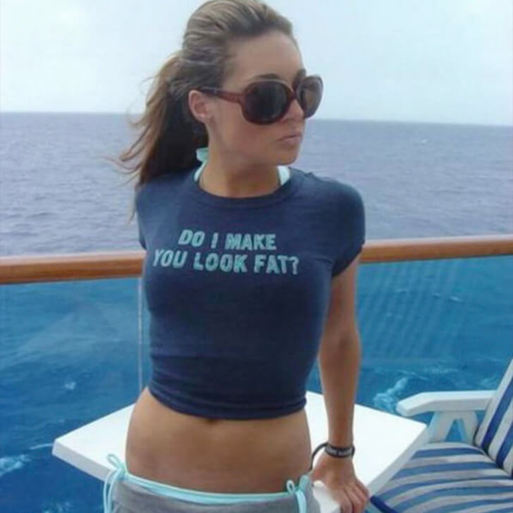 Eindeutig ein Statement, das Selbstbewusstsein ausstrahlt und zeigt, dass sie stolz auf ihren Körper ist. Während das Shirt in der Sonne glänzt, kann man sich des Grinsens nicht erwehren. Es ist eine humorvolle Art, mit dem ewigen Thema Körperwahrnehmung umzugehen. Und wenn wir schon dabei sind, sich über die kleinen Dinge im Leben zu amüsieren – nein, liebe Shirt-Aufschrift, du lässt niemanden dick aussehen. Du bringst uns eher dazu, uns selbst nicht so ernst zu nehmen!