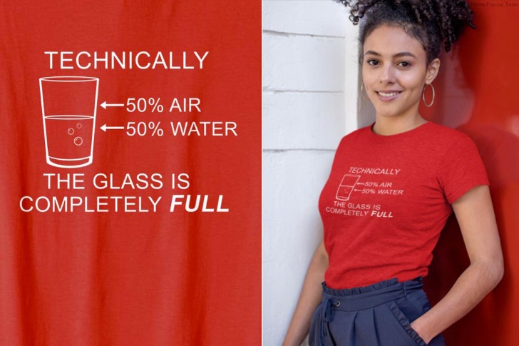Wer kennt sie nicht, die alten Weisheiten von halbvollen oder halbleeren Gläsern? Doch hier kommt die Revolution für alle Optimisten, Pessimisten und Realisten zugleich: Ein T-Shirt, das mit einem Augenzwinkern verkündet, das Glas ist immer voll – zu 50 Prozent mit Wasser, zu 50 Prozent mit Luft.