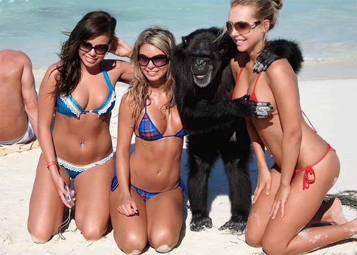 Nous avons grandi en apprenant l’évolution et les liens entre les chimpanzés et les humains. Ce chimpanzé en est la preuve. Sa capacité à poser pour une photo de groupe avec ces femmes est remarquable. Il n’est pas surprenant que les chimpanzés apprécient aussi les plages. Comme les humains, ils aiment l’eau, mais la natation n’est pas innée pour eux, nécessitant un apprentissage.