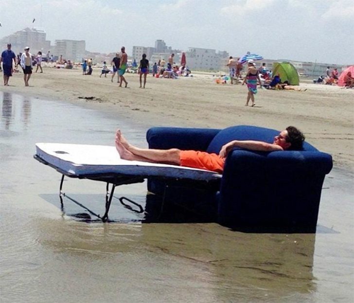 Sur un coussin confortable, sans sable, profitant de la vue côtière naturelle – voilà le paradis pour cet homme. C’est certainement un jour de confort optimal, imprégné de sérotonine grâce aux bienfaits naturels de la plage et du soleil. L’effet de relaxation qu’elle a obtenue à ce moment peut néanmoins l’avoir plongé dans un sommeil si profond que la marée montante l’a surpris.