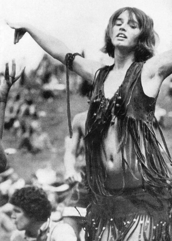Era anche uno di quegli indumenti che veniva indossato in modo religioso dai fan che seguivano i gusti di Jimi Hendrix. Infatti, il defunto musicista sfoggiò al festival una giacca bianca con le frange e, probabilmente, fu felice nel vedere altri (come la donna nella foto) indossare dei vestiti simili.