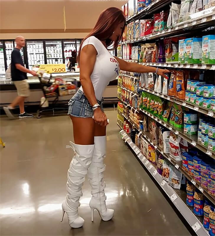 La femme sur cette photo a voulu reproduire ce concept en ramassant un paquet de granolas au supermarché. Elle a sûrement choisi de porter des bottes à talons aiguilles et un petit haut qui révèle ses bras musclés pour acheter du granola au supermarché. On peut croire, en toute bonne foi, qu’elle ne voulait pas attirer l’attention.