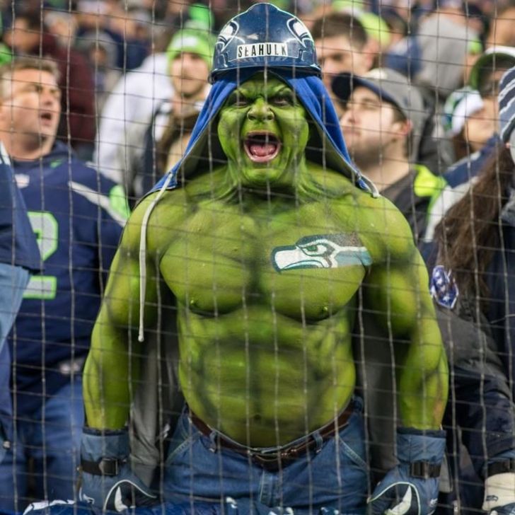 Dieser Fan hat sich mächtig ins Zeug gelegt, um seine Mannschaft anzufeuern. Bei einem Spiel der Seattle Seahawks verwandelte er sich nämlich in einen “Sea Hulk”. Auf jedes Detail hat er dabei geachtet. Sein Oberkörper und Gesicht sind komplett grün angemalt und auch die Muskeln von Hulk durften nicht fehlen. Durch seinen Helm und den Seeadler auf seiner Brust ist er aber trotzdem noch als Fan der NFL-Mannschaft zu erkennen. Der Fotograf hat genau in dem Moment das Foto geschossen, als der Mann scheinbar einen Schrei oder einen Schlachtruf von sich gibt. Das tut er sehr emotionsgeladen und erinnert dabei noch ein Stückchen mehr an den richtigen Hulk.
