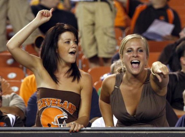 Hier sieht man zwei weibliche Fans der Cleveland Browns, einem Football-Team der US-amerikanischen National Football League. Sie sind mit voller Begeisterung dabei und feuern ihr Team an. Die eine Dame zeigt auf irgendetwas oder irgendjemanden. Es könnte ein Spieler sein, dem sie damit etwas sagen wollte oder vielleicht wollte sie ihre Freundin auf etwas aufmerksam machen. Diese schaut allerdings ganz woanders hin. Es könnte die Zeitanzeige oder der Spielstand sein. Wie das Spiel ausgegangen ist, wissen wir nicht, aber die beiden scheinen auf jeden Fall positiv gestimmt zu sein und waren mit Spaß bei der Sache. Solche Fans wünscht sich doch jeder Verein.