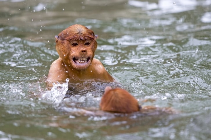 The proboscis monkeys are also known as long-nosed monkeys. They usually have long tails with reddish-brown skin. However, they acquire their long noses as adults, and the younger proboscis monkeys have smaller noses. The monkeys are endemic to the mangrove forests of the island of Borneo in Southeast Asia.