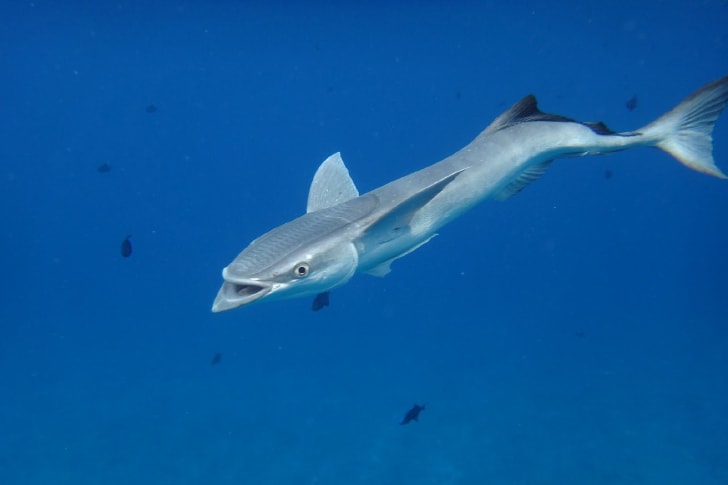 The remoras or suckerfish are ray-finned, which can grow to 12 to 43-inch lengths depending on the particular species. Their first dorsal fins are modified, and they function as suction-like organs, which is quite handy when hunting their prey. They can increase the suction power by sliding backward. When they swim forward, they release the suction hold.
