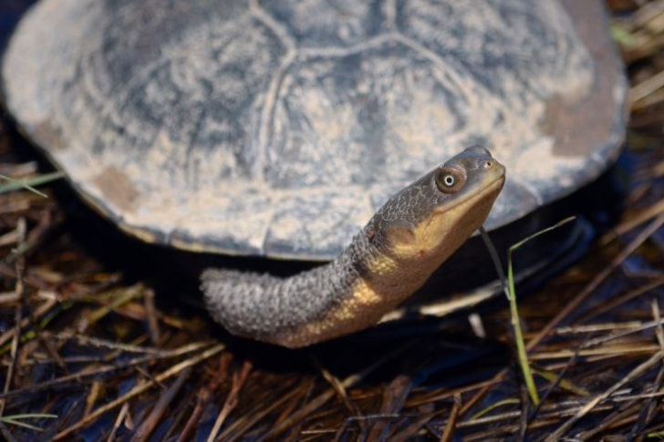 The eastern long-necked turtle is a snake-necked turtle endemic to eastern Australia. It inhabits diverse water bodies. As an opportunistic carnivorous feeder, its diet varies based on its environment. The turtle feeds on mollusks, insects, tadpoles, crustaceans, and frogs.