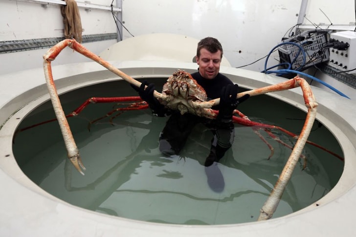 The crustaceans can grow to about 12 feet stretching from limb to limb across their spindly legs. They are also masters of disguise and will often put other animals or sponges on their shells so that they can blend in with the seafloor as a defensive mechanism. Their reproduction is in spring, and the laws in Japan prohibit fishing for them during this period.