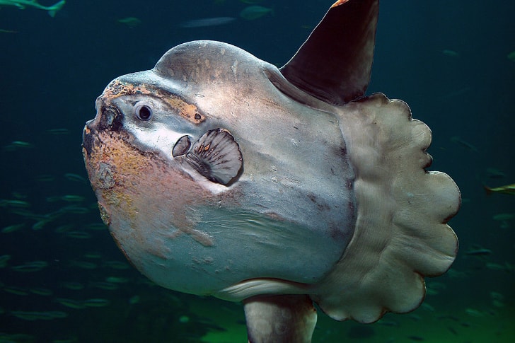 Commonly known as Mola mola, the Ocean sunfish is amongst the most massive bony fishes in existence. The adult fish tips the scales at about 545 lbs to 2,505 lbs. Their physical makeup looks like a fish head with a small tail attached. The species inhabits the temperate and tropical waters of our planet.