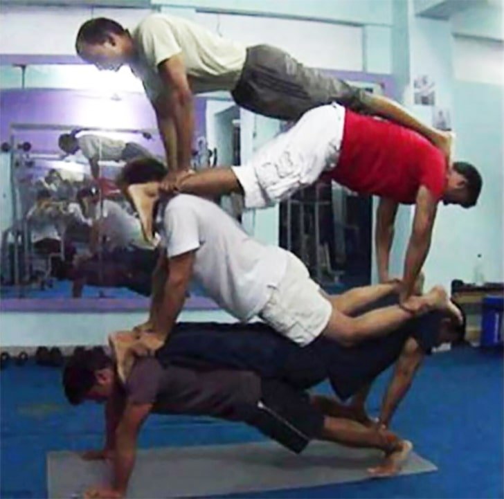 Aber diese Jungs sind auf einem anderen Level und bauen Plankpyramiden, als wären sie eine Cheerleader-Truppe oder so. Wir können nur hoffen, dass sich niemand verletzt hat, als die Pyramide umkippte, vor allem, weil es wahrscheinlich ist, dass der Kerl am unteren Ende der Pyramide der erste war, der sich in Position gebracht hat.