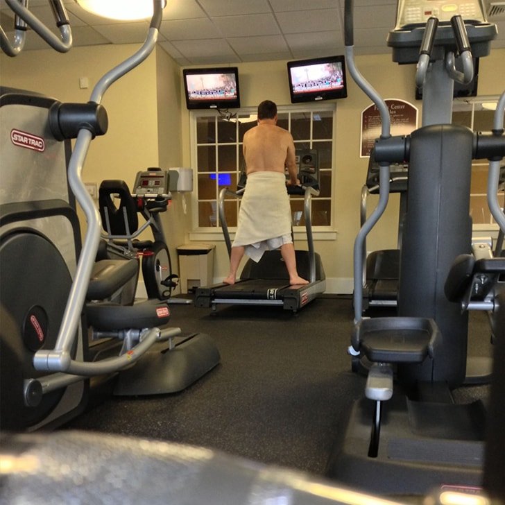 There are many ways we can see this image. We’d like to think that the man did his last exercise, took a shower, and then found he had one more treadmill session to complete. So he jumped out of the shower and onto the treadmill to finish his routine.
