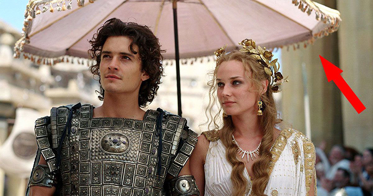 Despite mixed critical reception, the 2004 epic “Troy” attracted a huge box office draw. One notable oversight that’s been caught involves Paris and Helen riding through the streets beneath an umbrella to shield them from the sun. However, This type of umbrella wasn’t invented until the 5th century BCE by the Greeks, 800 years after the fall of Troy.