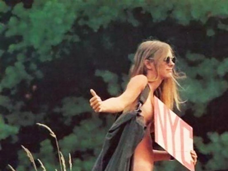 In den 1960er-Jahren war es noch völlig normal, per Anhalter zu reisen. Das lag vor allen Dingen auch daran, dass noch nicht so viele Menschen ein Auto hatten. Auf unserem Bild seht ihr das junge Mädchen, das ihren Daumen ausgestreckt hält, um eine Mitfahrgelegenheit zurück nach New York City zu finden. Ob es geholfen hat, dass sie scheinbar kein Oberteil trägt?