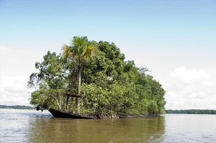 A shipwreck turned into a floating island forest captivates the imagination in the middle of calm waters. Shipwrecks can occur due to storms, navigational errors, or structural failures. Over time, seeds carried by birds or the wind find their way onto the wreck, leading to an astonishing growth of trees and plants.
