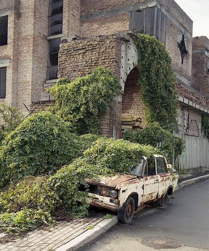 Parked on a sidewalk next to an abandoned building in Kyiv, Lada 2103 Zhiguli is being overtaken by ivy. The creeping green invader, with its disks growing from the stems, wraps around the car and the nearby structure. The scene is reminiscent of the 1958 horror film ”The Blob.”