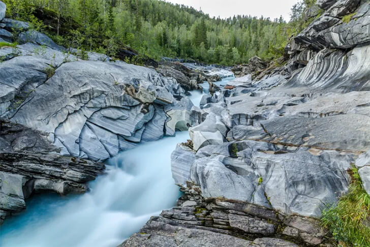 Next, we have Marmorslottet or The Marble Castle in Skonseng. Here, you’ll find yourself amidst a whimsical wonderland of marble sculpted by Mother Nature, who decided to unleash her artistic flair! This natural formation is composed of intricately carved rocks shaped over centuries by glacial movements and the flowing waters of the Reinelva River.
