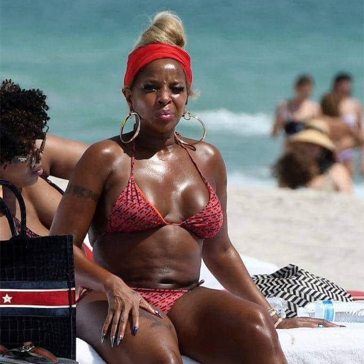 Mary J. Blige truly embodies the essence of timeless style and vitality. Captured here lounging on the beach, she sports a striking red and orange patterned bikini that complements her vibrant energy and toned figure. Known as the “Queen of Hip-Hop Soul,” Mary. J has influenced music both with her powerful voice and heartfelt lyrics, as well as through her resilience and authenticity.