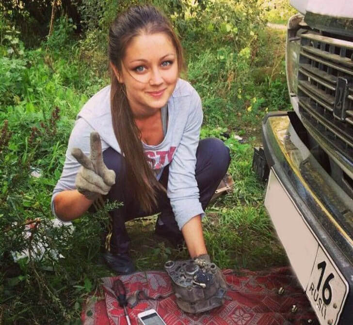 This lady combines good looks and mechanical know-how in one single Russian-style package, and she knows what she’s doing. We? Well, we have no idea what that metally thing is used for, and we refuse to take the time to learn!