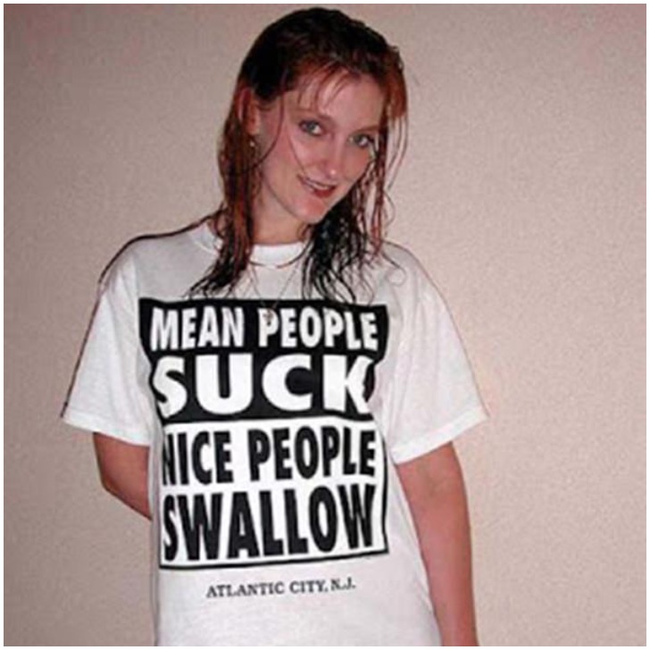 The phrase “mean people suck” is a common way of expressing frustration towards individuals who behave negatively toward others. Conversely, “nice people swallow” may be interpreted as praise for those who are kind and accommodating.