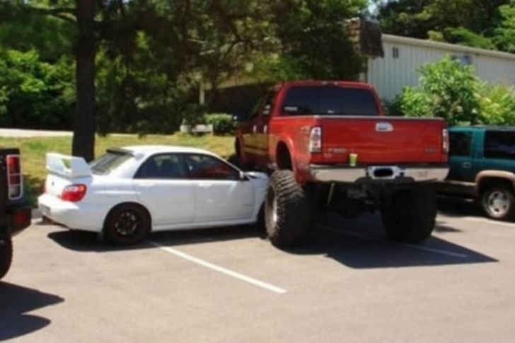 A lot of people shouldn’t be awarded a driver’s license because even the simplest task of parking seems difficult for them. In this picture, it’s not rocket science to figure out who is at fault here. We don’t understand how the owner of the white car managed to slide under the monster truck when they should have parked vertically!