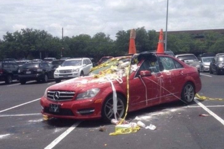 Parking in two spaces may be seen as an awful mistake, but taking up four? It is diabolical. So parking vigilantes just had to avenge those who couldn’t park on an obviously packed day. They didn’t just settle for a perfectly written note; they chose to start a big mess no one would want to clean up after.