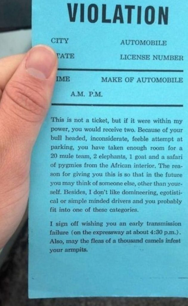 The driver who received this “ticket” might have been confused and annoyed upon reading this. Not only was the person who penned this note prepared, they were also a creative wordsmith who was fed up with encountering this type of person. This paper might not have legal powers but it sure hit differently.