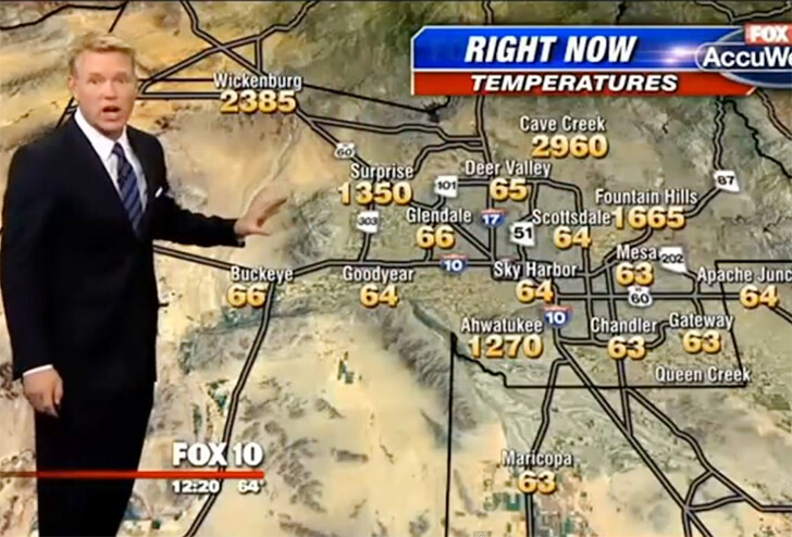 Doch der Meteorologe hatte sogar Spaß an dem offensichtlichen Fehler und meisterte die Situation mit Humor. So scherzte er, dass das Wetter in Cave Creek “ziemlich übel” war und Wickenburg wettertechnisch sogar einen “Totalschaden” erlitt. Wir hoffen natürlich, dass niemand den Wetterbericht an diesem Tag allzu ernst genommen hat, aber wer weiß, was die Zukunft bringt?