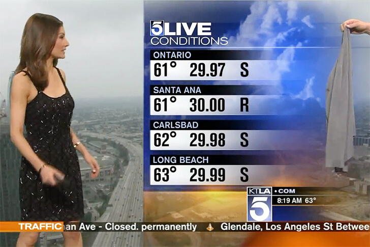 Oh nein! Liberte Chan von KTLA stand aufgrund ihrer Kleiderwahl schön öfter in der Kritik, auch als sie ein schwarzes und glitzerndes Kleid trug, das angeblich nicht zu einer Wettervorhersage passte. Mitten in ihrer Reportage wurde ihr deshalb eine Strickjacke gereicht, um das kleine Schwarze zu bedecken.