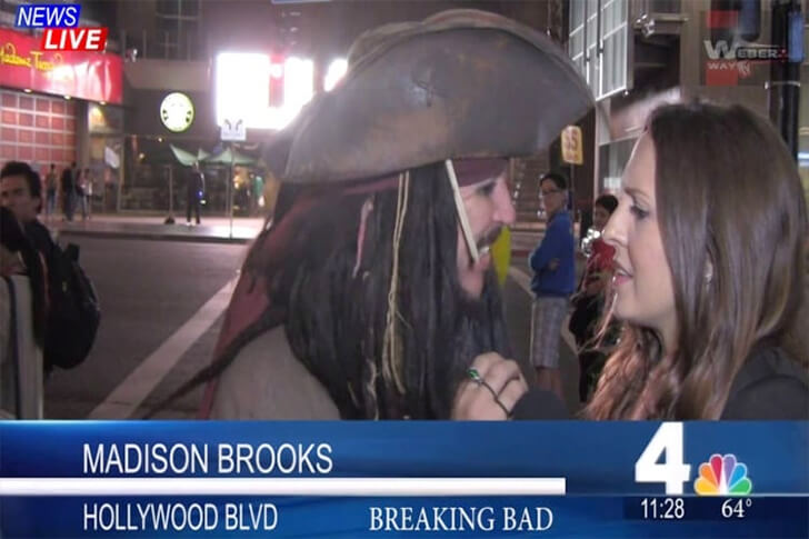 Die Premiere des “Breaking Bad”-Finales am Hollywood Boulevard war ein sehr großes Ereignis in der Film- und Serienwelt. NBC4-Reporterin Madison Brooks war deshalb live vor Ort, um über die Stimmung zu berichten. Plötzlich wurde sie aber von einem Mann gestört, der aussah wie Jack Sparrow aus “Fluch der Karibik”.