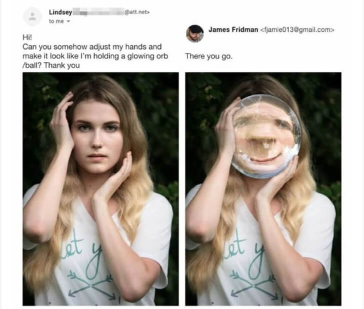 Even though we believe the original photograph to be extremely arresting, we are unable to fathom what Lindsey was intending to achieve by making such an odd request. We can guarantee that she wasn’t anticipating that she would end up appearing like a cartoon character. At least she obtained her “orb” or “ball,” but the finished result is far different from the one she had envisioned.