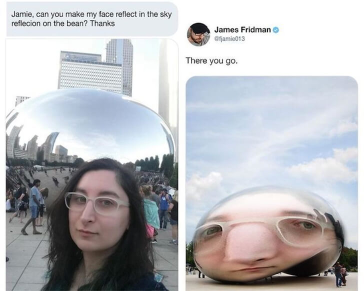 This picture seems so familiar that it must have been taken yesterday. Oh, wait it’s the same as the picture of the girl holding the orb who requested to be Photoshopped before. These guidelines are just as difficult to understand. The user contacted Fridman and asked that he “create my face reflect in the sky projection on the bean.”