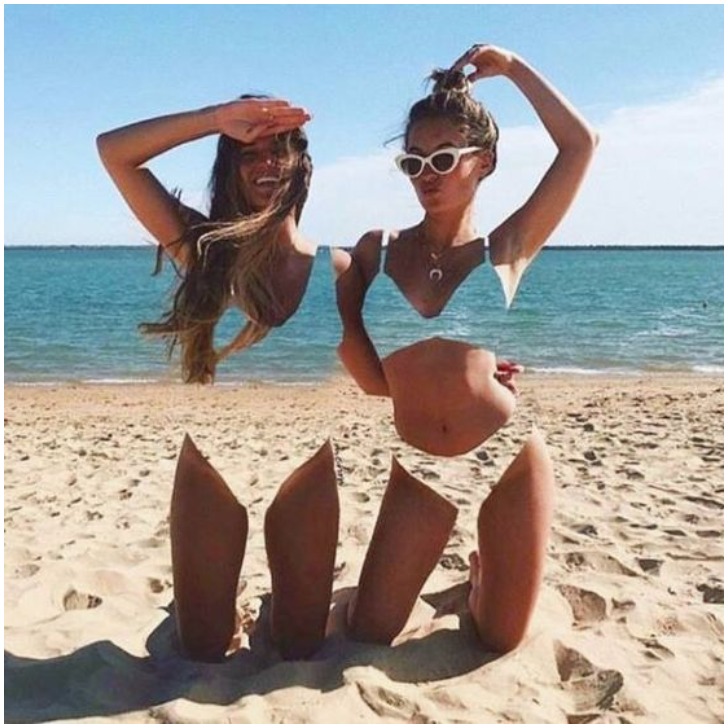 The art of photography and editing is something only a few can get right. Whoever has clicked this picture definitely has got it. From the über cool pose of the ladies having a good time at the beach to the missing body portions filled in by the water and sand. How mind-blowingly creative!