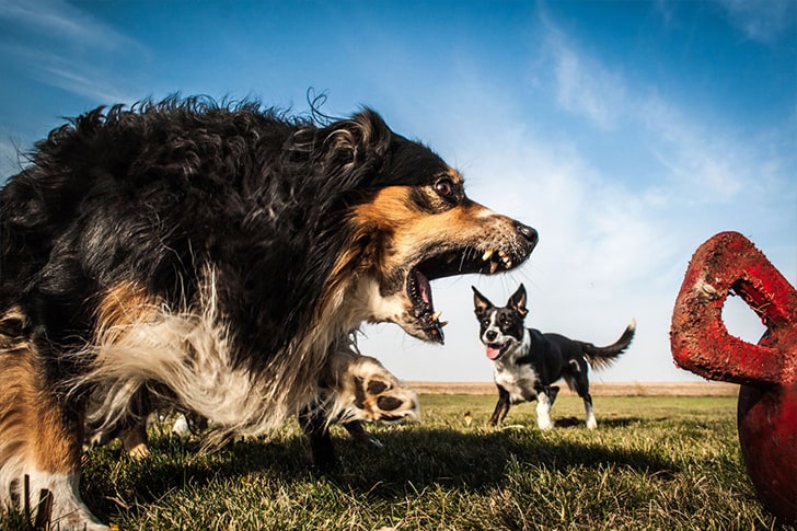 The dog in the background looks timid compared to the one in the foreground that looks like he’s growling ferociously. When you think about it, the photographer might have just framed the photo that way, and the dog in the foreground could have just been yawning.