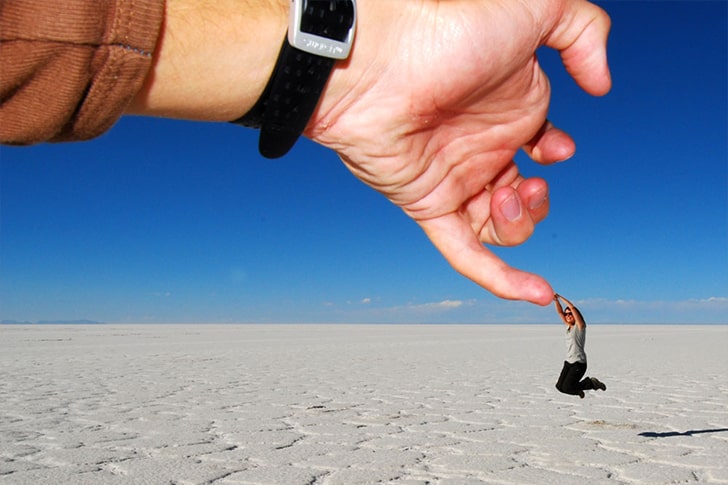 A trip to the largest salt flat, El Salar de Uyuni, is highly recommended when visiting the country. The location served as the backdrop of this photo which plays around with perspective. The sense of depth between the lady and the person taking the photo, with his hand dangling in front of the lens, makes her look tiny.
