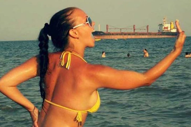 Dank des perfekten Winkels wirkt dieses Foto so, als würde die Frau ein riesiges Frachtschiff mit Tausenden von Tonnen wertvoller Güter verschlucken. Wir hoffen, dass sie am Ende nicht auch noch andere Menschen gefressen hat, die sich im Wasser vergnügten.