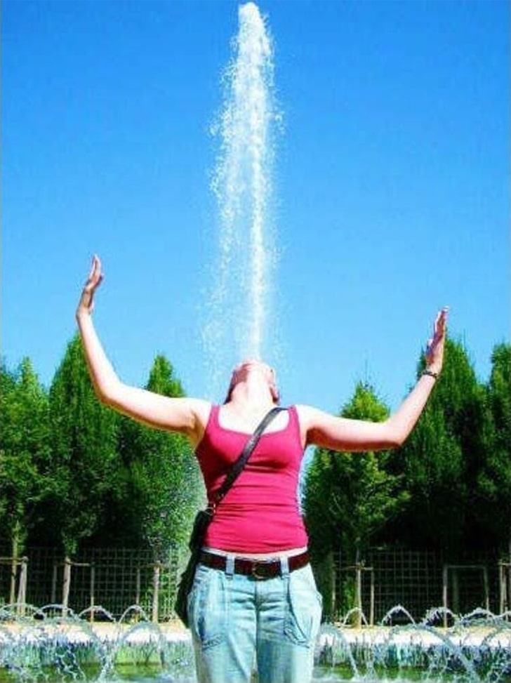 Gibt es einen Guinness-Weltrekord für das höchste Wasserprojektil, das aus dem Mund eines Menschen Frau geschossen wurde? Wenn nicht, dann sollten wir diese Dame für den Rekord anmelden, denn, Junge, das ist mal eine Fontäne, die aus ihrem Mund kommt. Apropos Springbrunnen, ist das nicht einer hinter ihr?