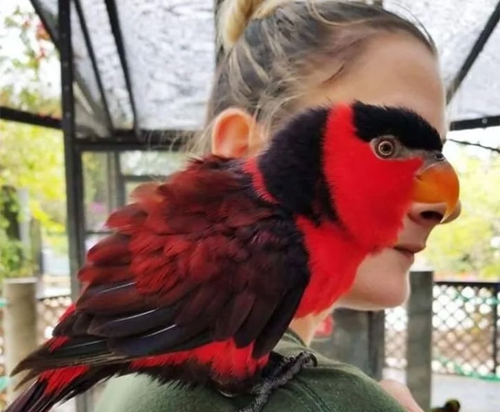 Die abgebildete Dame hatte ihren treuen gefiederten Begleiter auf der Schulter sitzen, was zu einem perfekten Bild führte. Die Fotografin hat einen Volltreffer gelandet, denn der Bildausschnitt sieht aus wie ein Kunstwerk. Der Vogel ist so positioniert, dass man ein paar Mal hinschauen muss, um zu erkennen, dass es sich um sein Auge handelt und nicht um ihres.