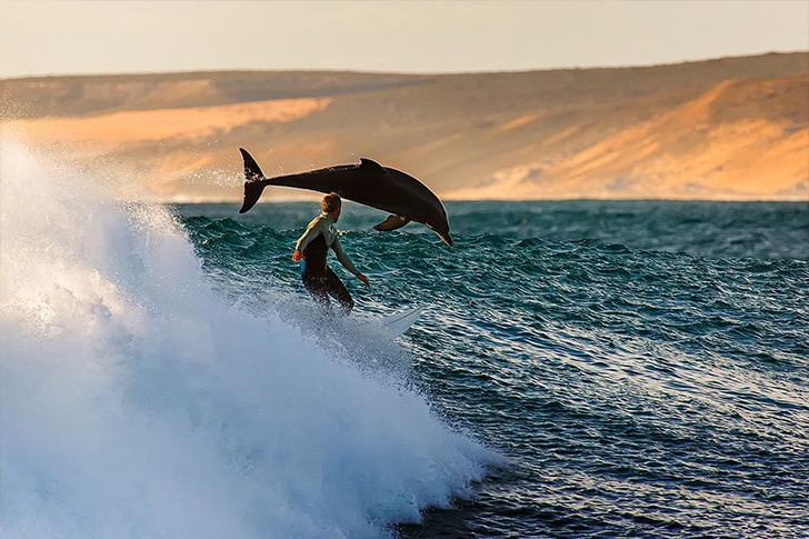 Delfine sind ebenfalls dafür bekannt, dass sie spielerisch aus dem Wasser auftauchen, um lästige Parasiten abzuschütteln oder um zu kommunizieren. Genau das scheint hier geschehen zu sein, als der Delfin einen Surfer auf den Wellen entdeckte. Es sieht aus wie ein Kräftemessen zwischen den beiden und ist zweifelsohne eine sehr schöne Aufnahme.