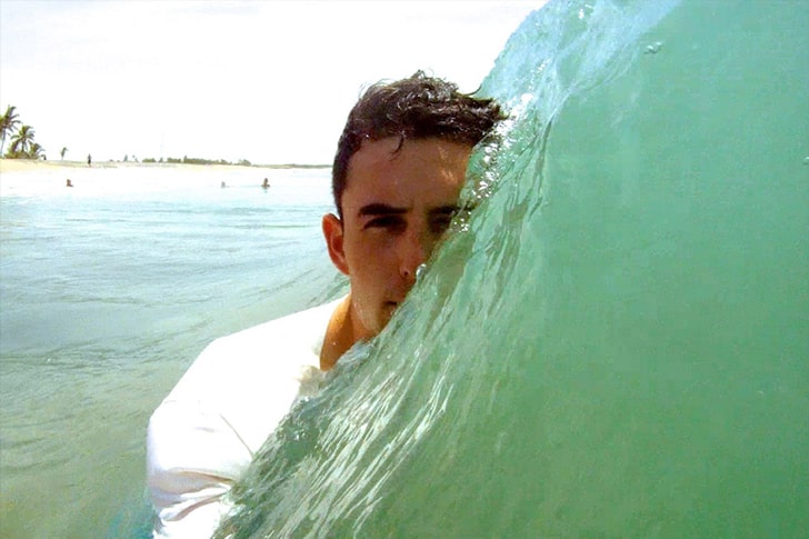Es sieht so aus, als würde er friedlich auf der wachsenden Welle aus türkisfarbenem Wasser ruhen. Er muss die Welle kommen gesehen haben und beschloss, ein Selfie zu machen, als sie ihn umspülte. Sein Timing ist tadellos, denn er hat es geschafft und dabei absolute Ruhe bewahrt. Das ist zweifellos anders als die meisten Fotos, die wir gesehen haben.